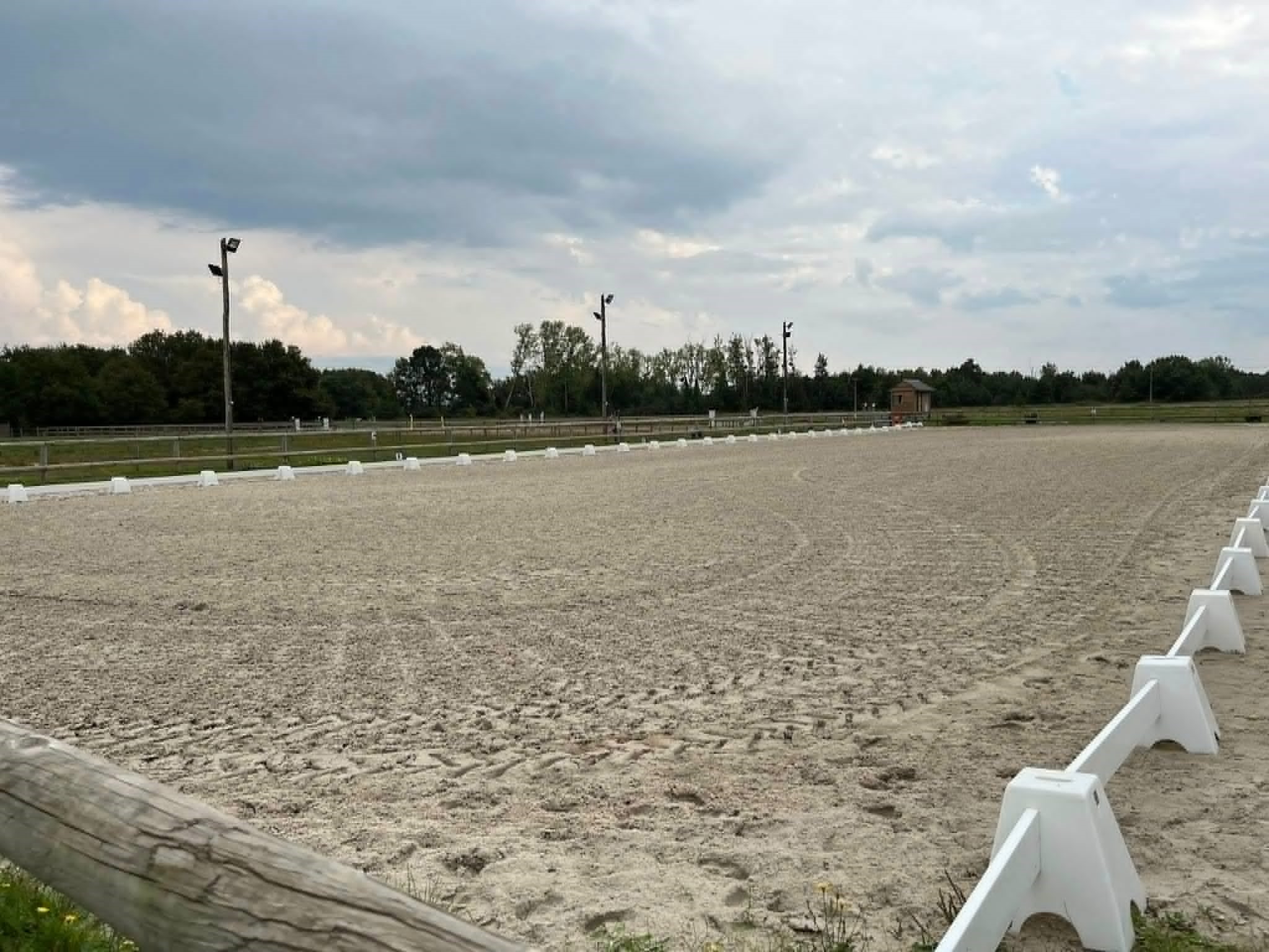 Cette grande carrière de dressage en sable de Fontainebleau est particulièrement adaptée au travail du dressage y compris par temps humide. Une structure drainante a été mise en place lors de son installation.