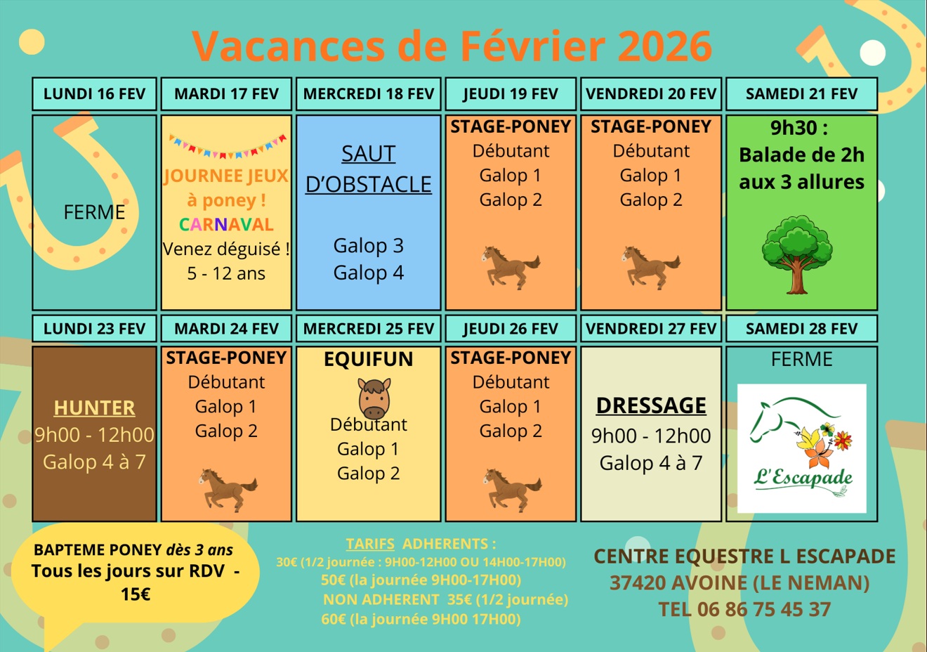 Vacances de Noël 2025 Vacances de février 2026 Du lundi 16 au samedi 28 février 2026 C'est fou non !? On vient à peine de reprendre, qu'on pense déjà aux vacance !! Retrouver ici le programme des vacances de Février, avec de bonnes résolutions et un nouveau design ✏️ Contactez-nous ! +33 (0)6 86 75 45 37